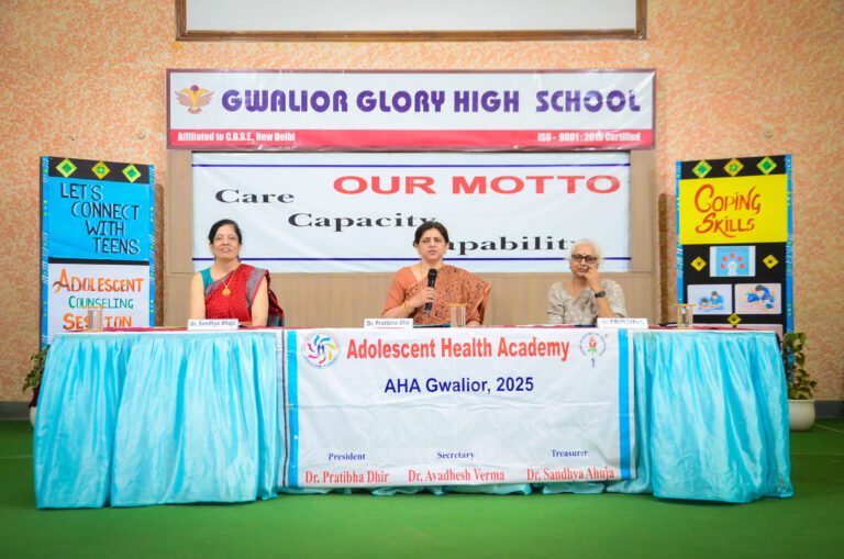 Adolescents Counselling Session ‘Helping young minds navigate challenges today, so they grow stronger and wiser tomorrow’ Gwalior Glory High School hosted an insightful and engaging counseling session for its senior students as they embark on the exciting journey of their teenage years. Two distinguished Guest Experts were invited to lead the session Dr. Pratibha Dhir, Senior Consulting Pediatrician and President of the Adolescent Health Academy, and Dr. Sandhya Ahuja, Child Specialist and Pediatrician – both renowned voices in the field of adolescent well-being. Dr. Pratibha Dhir opened the session by guiding students through the nuances of stress and how to identify it, understanding its positive and negative effects, and exploring the key causes of stress among adolescents. The session was then seamlessly carried forward by Dr. Sandhya Ahuja, who delved deeper into coping strategies tailored to the challenges most commonly faced during the teenage years. The Glorians engaged with curiosity and enthusiasm, eager to understand not only how stress shapes their teenage experience, but also how to rise above it and truly become the best versions of themselves.