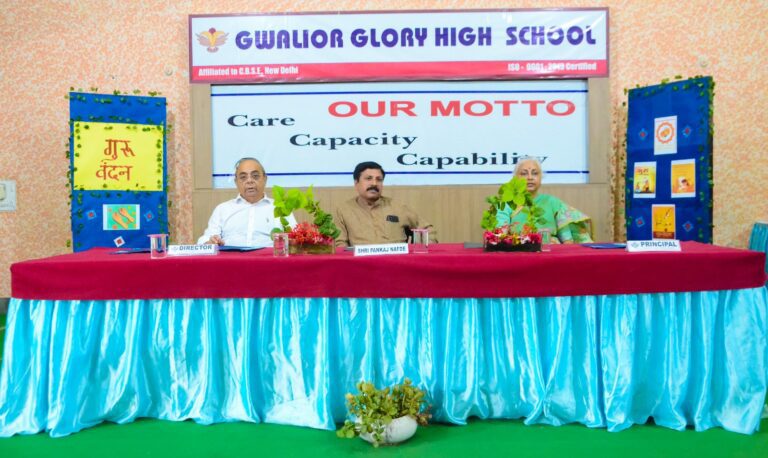 Gwalior Glory High School hosted a heartfelt *Guru Vandan Session* for Class IX students, graced by School Director *Mr. Gopi Mandhan* and Principal *Dr. Rajeshwari Sawant*. Guest speaker *Mr. Pankaj Nafde*, noted social worker and President of Bhagini Nivedita Shiksha Samiti, spoke about the timeless role of a Guru and India’s profound contributions to science, medicine, and philosophy. 🌱 A sapling and memento were presented as a token of gratitude. The session beautifully honoured the spirit of learning and the legacy of knowledge. 🇮🇳